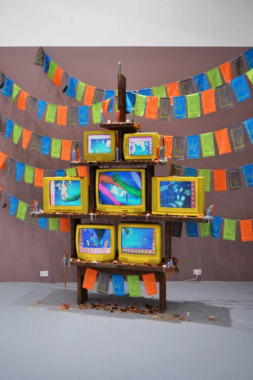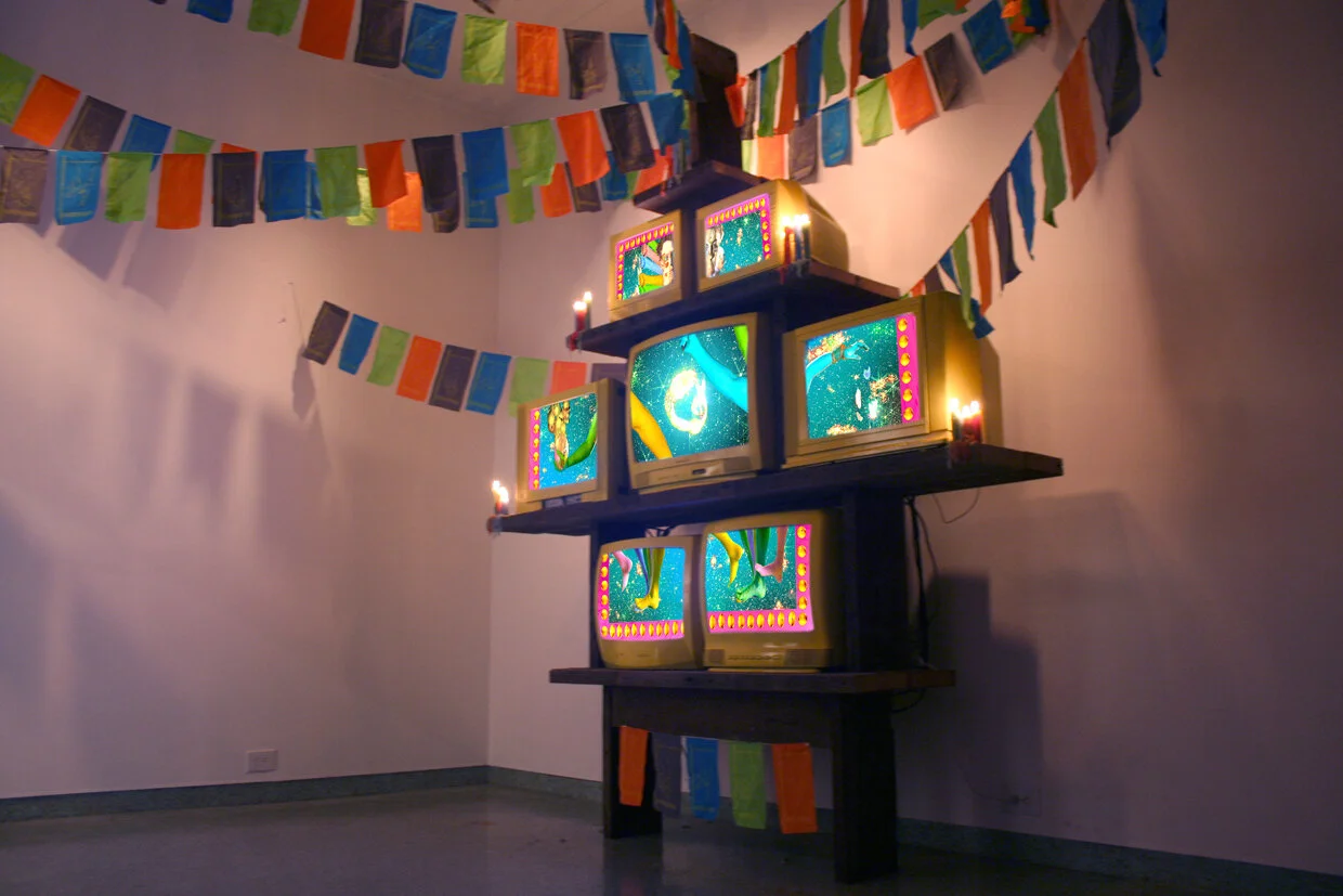 7-channel video loop, CRT tvs, wood, candles, flags